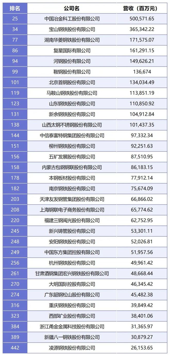 7月12日,2022年《財富》中國500強排行榜揭曉,32家鋼鐵及相關企業上榜。其中,中國中冶(營收約5006億元,排名第25位)、寶鋼股份(營收約3653億元,排名第34位)、華菱鋼鐵(營收約1716億元,排名第77位)、復星國際(營收約1613億元,排名第86位)、河鋼股份(營收約1496億元,排名第94位)、鞍鋼股份(營收約1367億元,排名第99位)這6家企業進入前100名。