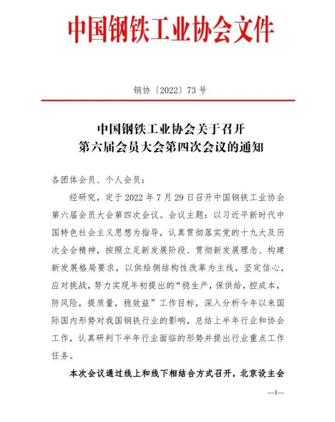 中國(guó)鋼鐵工業(yè)協(xié)會(huì)關(guān)于召開(kāi)第六屆會(huì)員大會(huì)第四次會(huì)議的通知