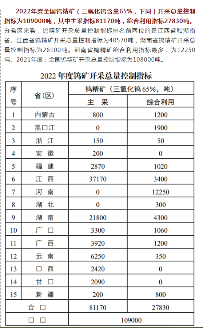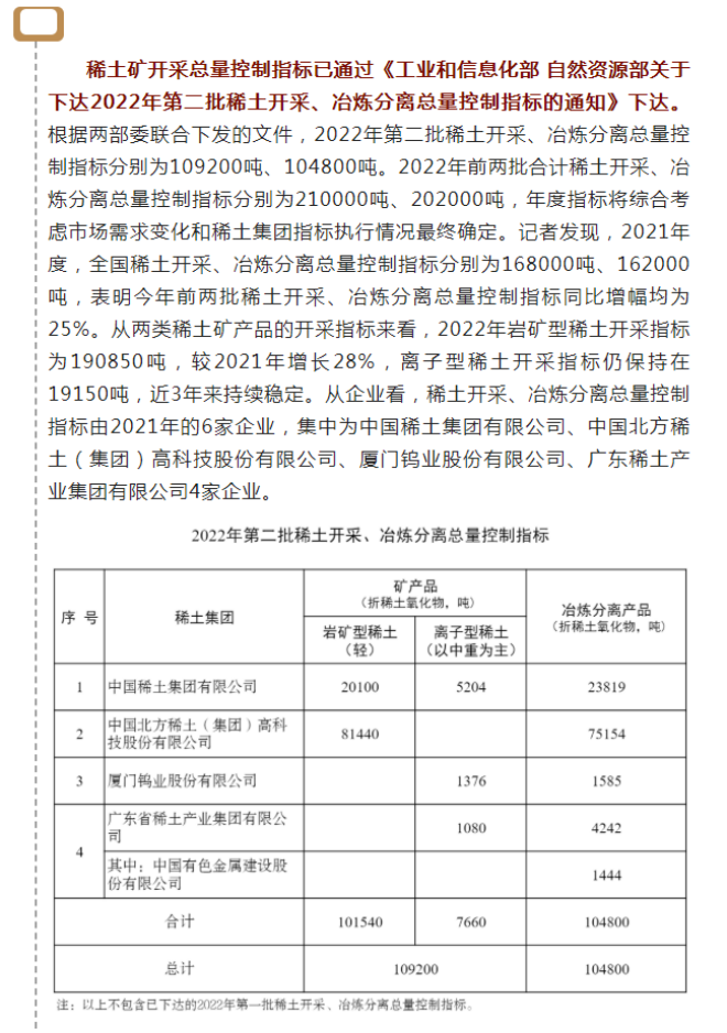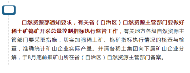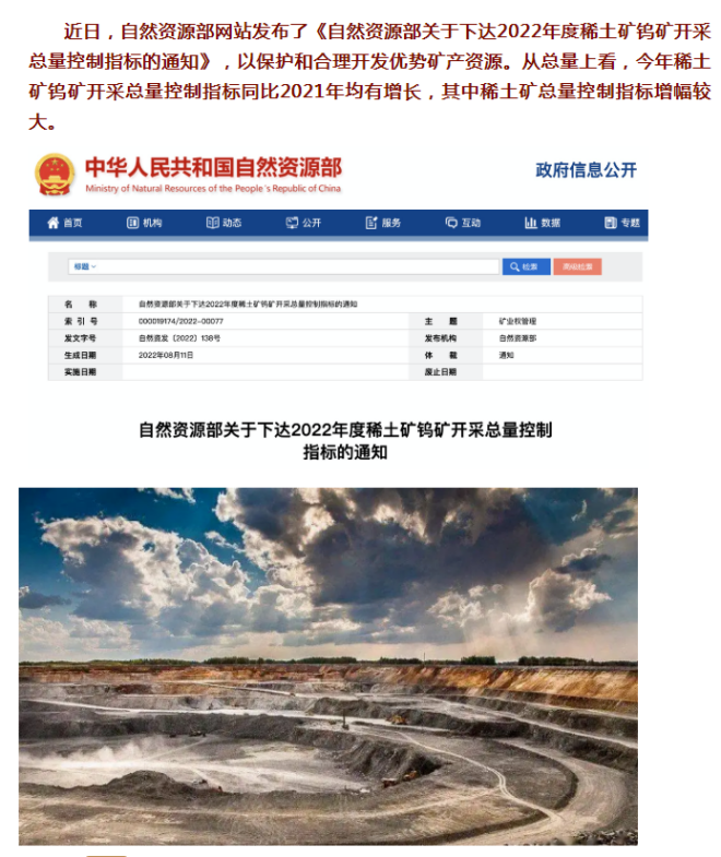 自然資源部:稀土礦鎢礦開采總量控制指標(biāo)下達(dá),稀土總量控制指標(biāo)同比增幅25%,企業(yè)由6家集中到4家