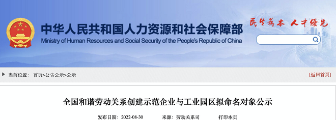 8月30日,人社部網站發布了《全國和諧勞動關系創建示范企業與工業園區擬命名對象公示》(以下簡稱“《公示》”)。