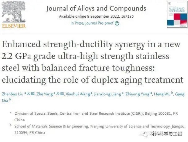 近日,鋼鐵研究總院特殊鋼研究院劉振寶教授團隊及南京理工大學沙剛教授團隊通過合金設計及熱處理工藝調控研發了一種新型2.2GPa級超高強度不銹鋼,其室溫力學性能指標為:屈服強度1876MPa、抗拉強度2259MPa、斷后伸長率11.5%、斷面收縮率52%以及平面斷裂韌性43 MPa·m0.5。并基于多尺度、多層級表征結果,針對該合金體系鋼種,提出了一種簡單有效的優化其強-塑性匹配的熱處理工藝,即雙重時效處理工藝。