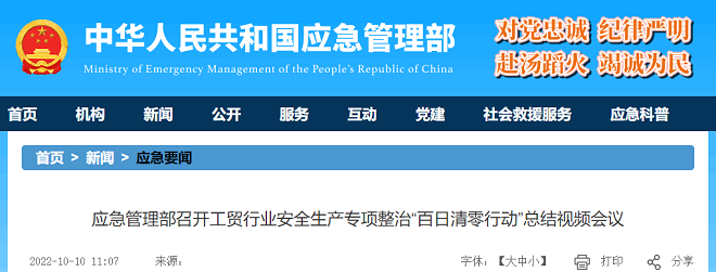 10月9日,應急管理部以視頻方式召開工貿行業安全生產專項整治“百日清零行動”總結會議,深入學習貫徹習近平總書記關于安全生產重要指示精神,落實全國安全生產電視電話會議部署,總結“百日清零行動”工作成效,安排部署下一階段重點工作。應急管理部黨委委員、副部長宋元明在主會場出席會議并講話。