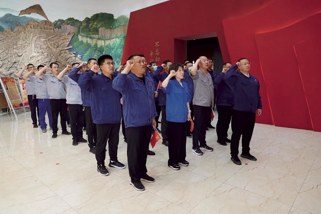 2022年7月1日,在普陽鋼鐵集團董事長郭龍鑫的帶領下,該集團各黨支部部分黨員在晉冀魯豫邊區革命紀念館重溫入黨誓詞。(普陽鋼鐵 供圖)
