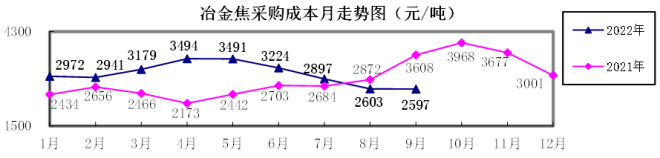 冶金焦9月份加權平均折算成干基的采購成本2596.84元/噸,環比下降6.51元/噸,降幅為0.25%。1—9月累計平均折算成干基的采購成本為3038.26元/噸,同比升高372.54元/噸,升幅為13.98%。