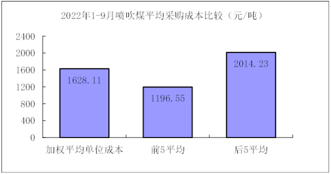 噴吹煤9月份加權平均折算成干基的采購成本為1560.83元/噸,環比升高113.84元/噸,升幅為7.87%。1—9月累計平均折算成干基的采購成本為1628.11元/噸,同比升高467.31元/噸,升幅為40.26%。
