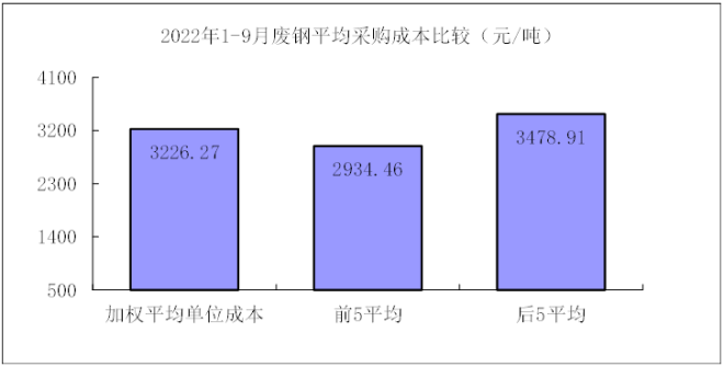 1—9月對標企業廢鋼平均采購成本最低的前5家企業的加權平均采購成本為2934.46元/噸,比對標企業平均采購成本低291.81元/噸,低于平均采購成本9.04%;而采購成本最高的5家企業加權平均采購成本為3478.91元/噸,比對標企業平均采購成本高252.64元/噸,高于平均采購成本7.83%。