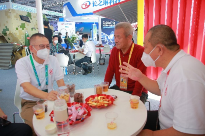 航天英雄楊利偉(左三)蒞臨展位,與披堅(jiān)執(zhí)銳新材料團(tuán)隊(duì)帶頭人董瀚教授等領(lǐng)導(dǎo)交流