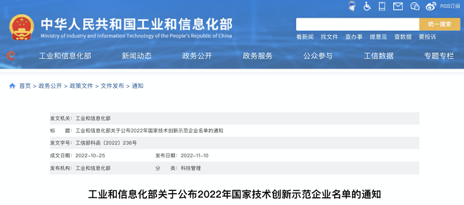 近日,中華人民共和國工業和信息化網站發布了《工業和信息化部關于公布2022年國家技術創新示范企業名單的通知》(以下簡稱《通知》)。