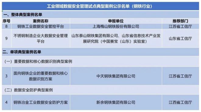 根據《工業和信息化部辦公廳關于組織開展工業領域數據安全管理試點典型案例和成效突出地區遴選工作的通知》,工業和信息化部組織開展了相關申報和評審工作,現將工業領域數據安全管理試點典型案例和成效突出地區名單進行公示, 公示時間為2023年1月29日—2023年2月3日。其中,梅山鋼鐵、泰山鋼鐵、中天鋼鐵、新余鋼鐵的4個鋼鐵行業案例上榜——