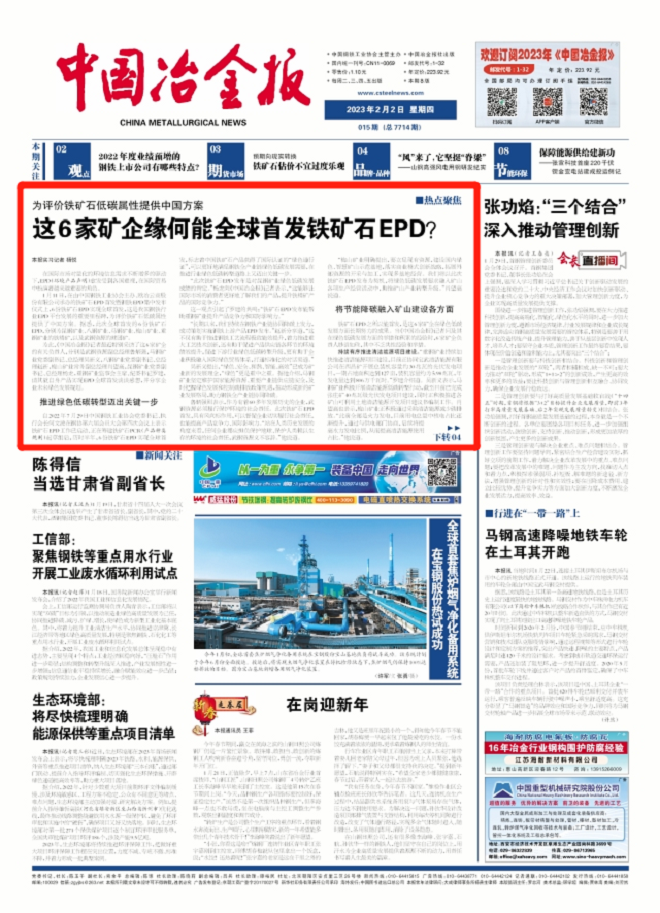 自2022年7月29日中國(guó)鋼鐵工業(yè)協(xié)會(huì)黨委書(shū)記、執(zhí)行會(huì)長(zhǎng)何文波在鋼協(xié)第六屆會(huì)員大會(huì)第四次會(huì)議上表示鐵礦石EPD工作已啟動(dòng)、正在籌建鐵礦石PCR(產(chǎn)品種類(lèi)規(guī)則)起草組后,歷時(shí)半年,6份鐵礦石EPD實(shí)現(xiàn)全球首發(fā),標(biāo)志著中國(guó)鐵礦石產(chǎn)品獲得了國(guó)際認(rèn)證的“綠色通行證”,可以更好地滿(mǎn)足鋼鐵全產(chǎn)業(yè)鏈綠色低碳發(fā)展需要,在推進(jìn)行業(yè)綠色低碳轉(zhuǎn)型道路上又邁出關(guān)鍵一步。