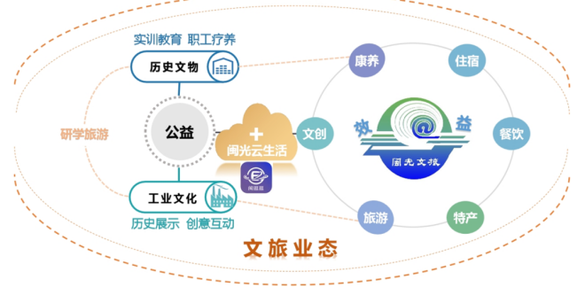 “文旅業態”發展路徑:保護歷史文物,創建萬壽巖學院;宣揚工業文化,建設“兩館”;開展三鋼特色工業文化旅游,建立集實訓教育、歷史展示、職工療養、研學旅游、創意互動等“五位一體”融合發展模式,打造生產、生活、生態“三生相融”的鋼鐵小鎮。并以此為基礎,持續拓展文旅產業品牌價值,探索“公益+效益”雙統一的文旅產業發展模式。此外,打造文旅線上平臺,將旅游、特產、住宿、餐飲、文創、康養等業務全部納入線上平臺,形成新型文旅融合發展業態(如圖3所示)。