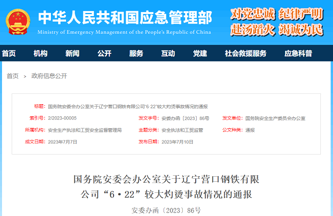 7月10日,中華人民共和國應急管理部網站發(fā)布了《國務院安委會辦公室關于遼寧營口鋼鐵有限公司“6·22”較大灼燙事故情況的通報》。
