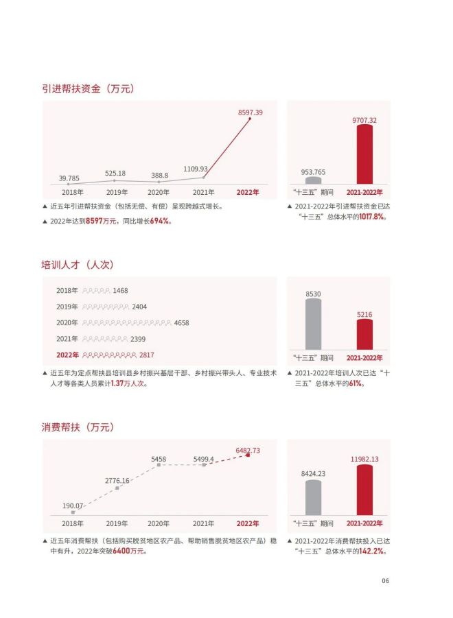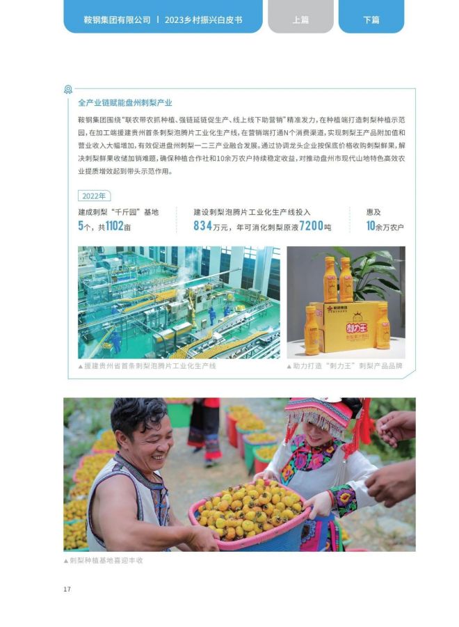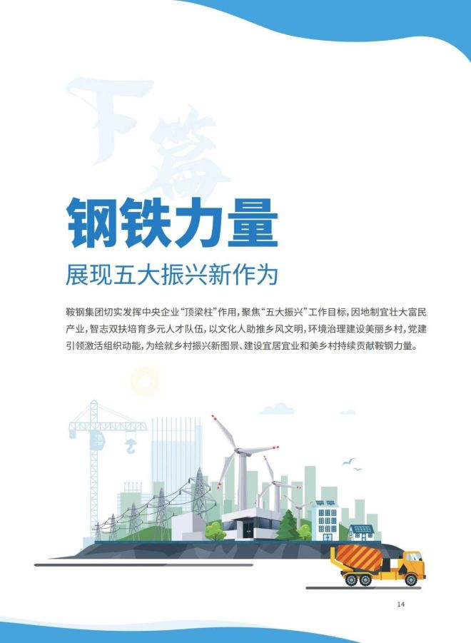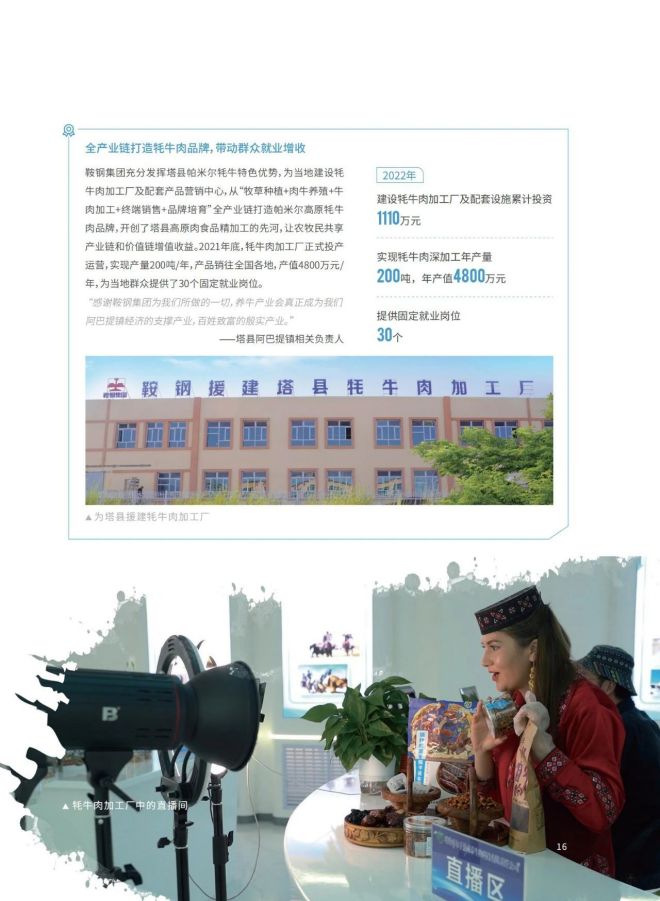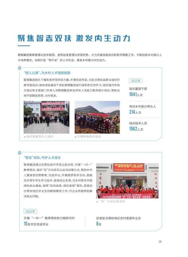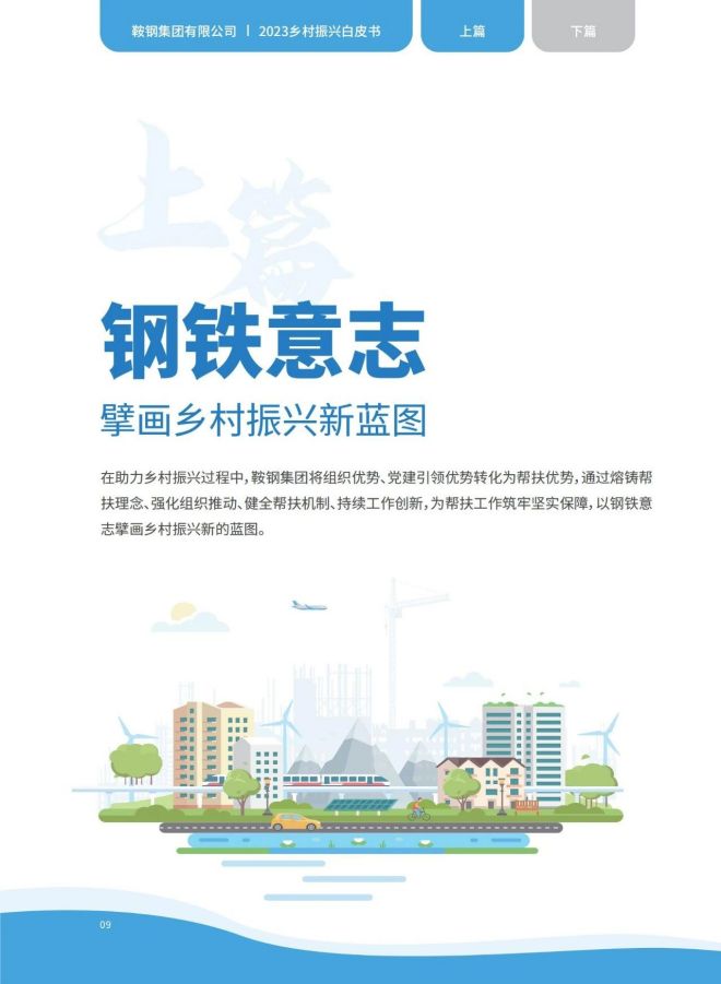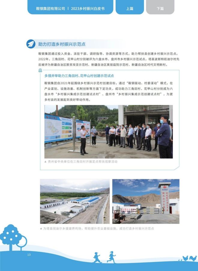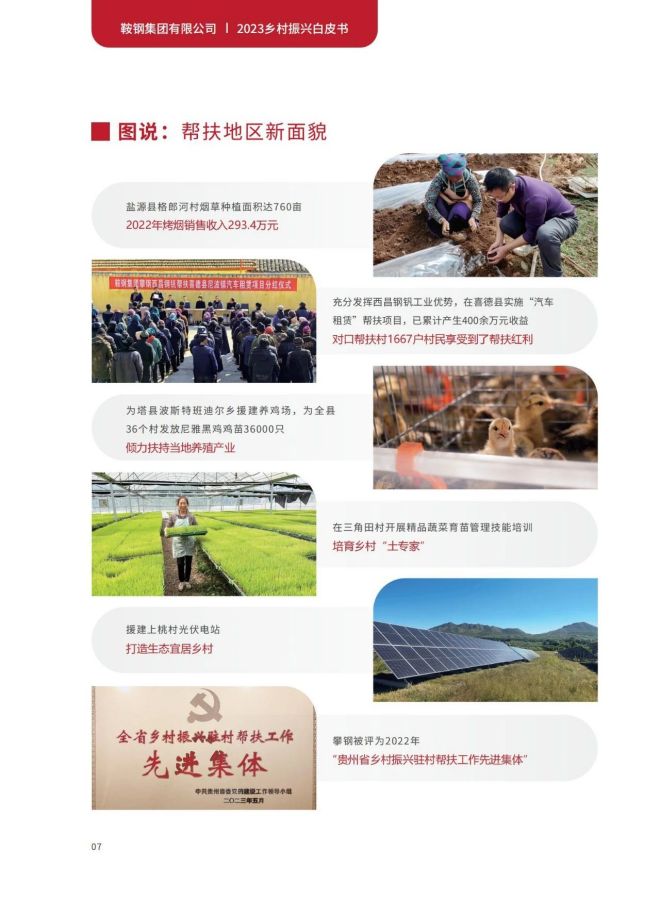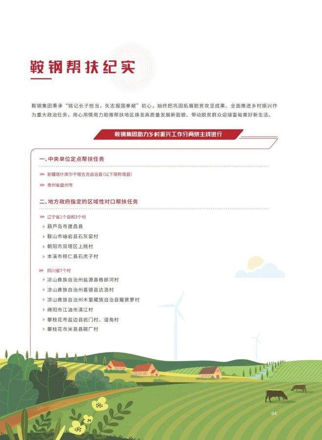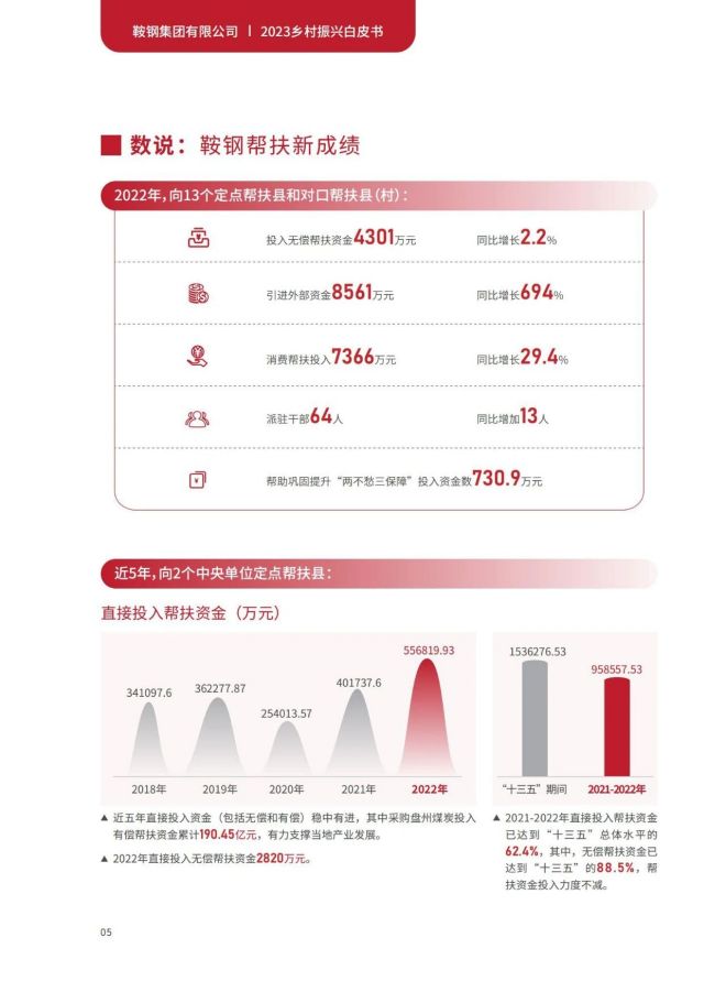 近日,《2023鞍鋼集團有限公司鄉村振興白皮書》發布,聚焦鞍鋼集團嚴格落實“四個不摘”要求,保持接續幫扶政策總體穩定、幫扶資金不減、幫扶干部派駐力度不減、幫扶重點突出,圍繞產業、人才、文化、生態、組織全面助力鄉村振興,持續鞏固拓展脫貧攻堅成果,做好“兩不愁三保障”重點工作,進一步深化消費幫扶。白皮書以數說、圖說、眾說的等方式生動形象地展現了鞍鋼集團幫扶工作取得的突出成績。讓我們一起翻開白皮書,了解鞍鋼集團助力鄉村振興工作成效——