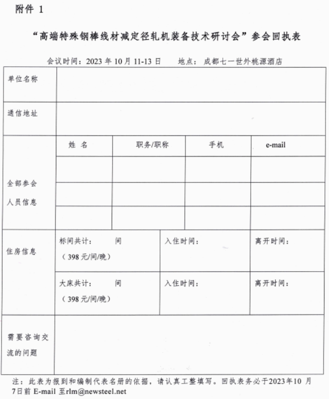 附件1.“高端特殊鋼棒線材減定徑軋機裝備技術研討會”參會回執表