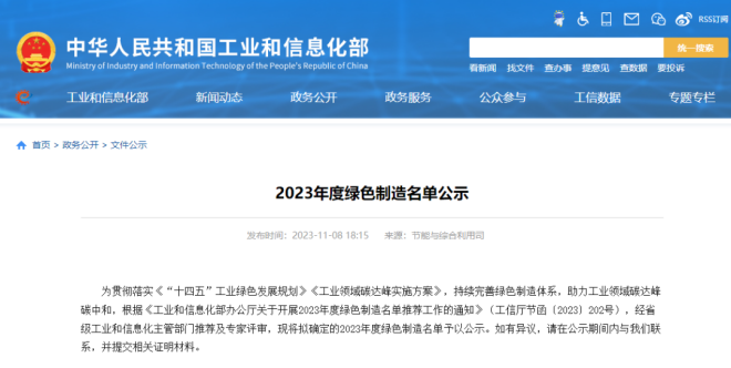 2023年11月8日,工業和信息化部網站發布《2023年度綠色制造名單公示》。