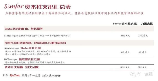 力拓在一份聲明中表示,幾內(nèi)亞西芒杜項(xiàng)目的開(kāi)發(fā)需要約116億美元的初始資金,而該公司在開(kāi)發(fā)Simfer權(quán)屬礦區(qū)和共同開(kāi)發(fā)西芒杜鐵路和港口基礎(chǔ)設(shè)施項(xiàng)目中所占份額的初始資本分配總額約為62億美元。
