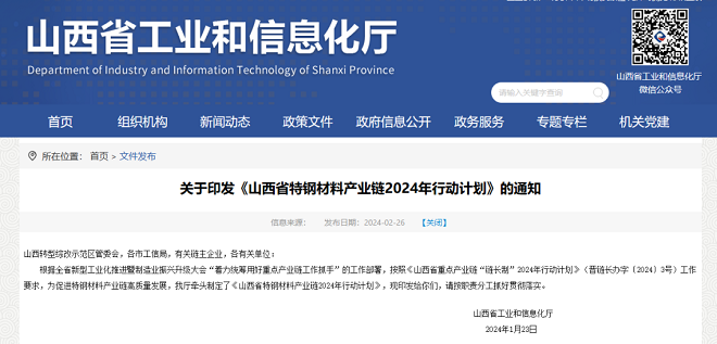 2月26日,山西省工信廳印發《山西省特鋼材料產業鏈2024年行動計劃》,計劃提出推進目標:產業鏈競爭力不斷提升。特鋼材料產業鏈營業收入年均增速保持在7%以上,到2024年力爭突破1400億元。培育5戶省級專精特新企業,吸引3個重大項目落地,每戶鏈主企業新引進產業鏈企業2戶。