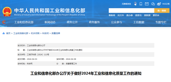 4月8日,工業和信息化部發布了《工業和信息化部辦公廳關于做好2024年工業和信息化質量工作的通知》(以下簡稱“通知”)。
