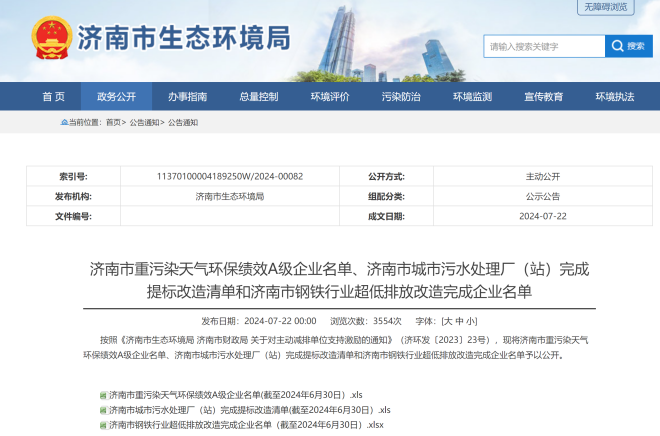 7月22日,濟南市生態環境局官網發布,濟南市重污染天氣環保績效A級企業名單、濟南市城市污水處理廠(站)完成提標改造清單和濟南市鋼鐵行業超低排放改造完成企業名單。