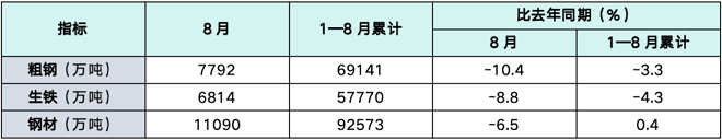 1-8月,中國粗鋼產量69141萬噸,同比下降3.3%;生鐵產量57770萬噸,同比下降4.3%;鋼材產量92573萬噸,同比增長0.4%。