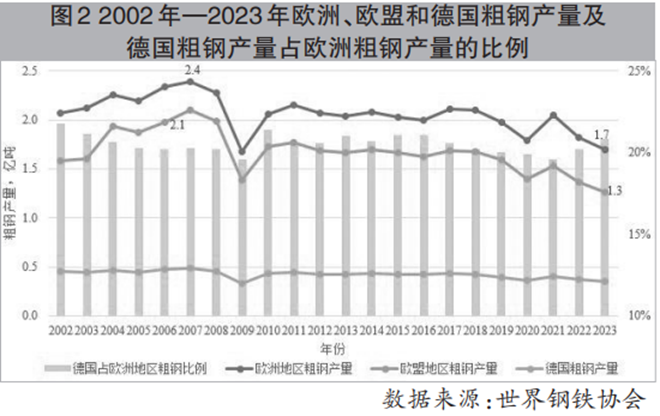 第四階段為2009年至今。在美國次貸危機、歐債危機、新冠疫情、俄烏沖突、歐洲能源危機、大規模通脹引發的上一輪加息周期等百年未有之大變局背景下,歐洲地區鋼鐵產業經歷了一波又一波的“寒冬”侵擾,粗鋼產量再次呈現波動下行趨勢,尤其進入到21世紀20年代以來,歐洲地區粗鋼產能基本維持不變,但產能利用率不斷下降,粗鋼產量這一波下行趨勢,尚難看到緩和的跡象。加之,鋼材貿易逆差擴大,嚴苛的環保、節能、低碳政策,使得歐洲鋼企成本優勢不在,企業效益普遍不好。這一時期,歐盟及各國加大了綠色化、低碳化、智能化等技術和裝備的研發投入,以期在低碳排放鋼鐵生產技術、流程工藝上獲得更大的競爭力。