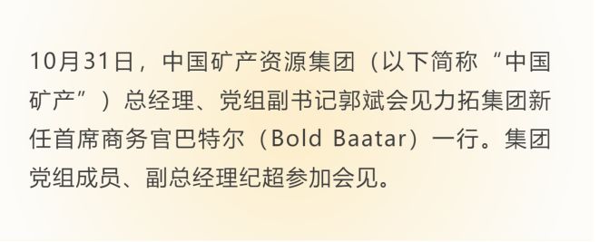 郭斌代表中國礦產對巴特爾一行表示熱烈歡迎。郭斌表示,中國礦產始終立足中國鋼鐵行業高質量發展,致力于為行業提供更加安全穩定、可持續的礦產資源供應鏈服務以及綠色、個性化的解決方案。力拓集團是全球鐵礦行業的領軍企業,在中國鋼鐵行業發展進程中作出了重要貢獻,同時也獲得了自身的發展。中國礦產成立兩年多以來,雙方在相關領域合作良好,中國礦產對此表示贊賞和感謝,也相信在巴特爾先生繼任首席商務官后,雙方將進一步深化合作,共同推進鋼鐵行業產業鏈供應鏈的可持續發展,攜手迎接更廣闊的未來。