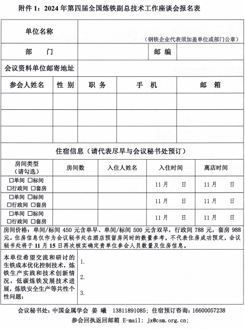 本次工作會議免收鋼鐵生產企業代表會務費,代表交通費用自理。參會煉鐵生產單位提交副總會大會主題報告、技術報告PPT,材料印刷截至日期為11月20日。