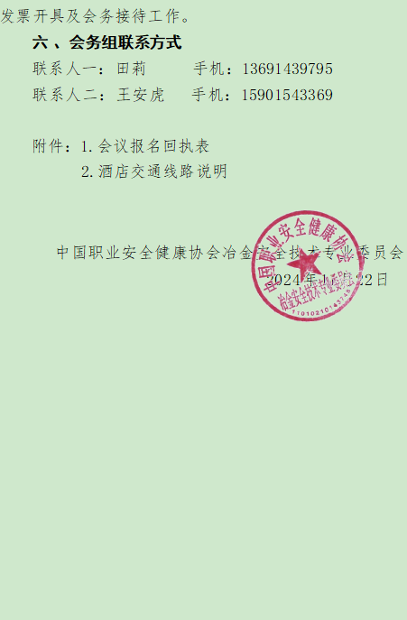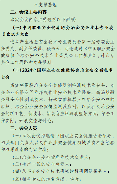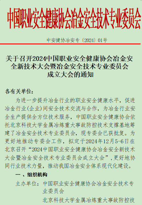 關(guān)于召開2024中國職業(yè)安全健康協(xié)會(huì)冶金安全新技術(shù)大會(huì)暨冶金安全技術(shù)專業(yè)委員會(huì)成立大會(huì)的通知
