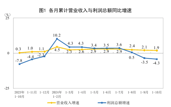 10月份,規(guī)模以上工業(yè)企業(yè)利潤同比下降10.0%。