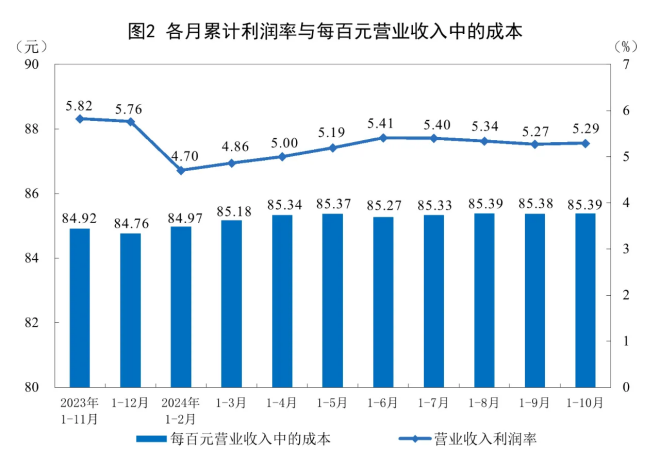 1—10月份,規(guī)模以上工業(yè)企業(yè)實現(xiàn)營業(yè)收入110.96萬億元,同比增長1.9%;發(fā)生營業(yè)成本94.75萬億元,增長2.3%;營業(yè)收入利潤率為5.29%,同比下降0.34個百分點。