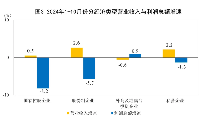 1—10月份,規(guī)模以上工業(yè)企業(yè)中,國有控股企業(yè)實現(xiàn)利潤總額18530.9億元,同比下降8.2%;股份制企業(yè)實現(xiàn)利潤總額43718.5億元,下降5.7%;外商及港澳臺投資企業(yè)實現(xiàn)利潤總額14559.0億元,增長0.9%;私營企業(yè)實現(xiàn)利潤總額16501.7億元,下降1.3%。