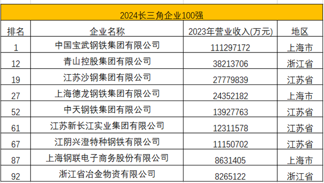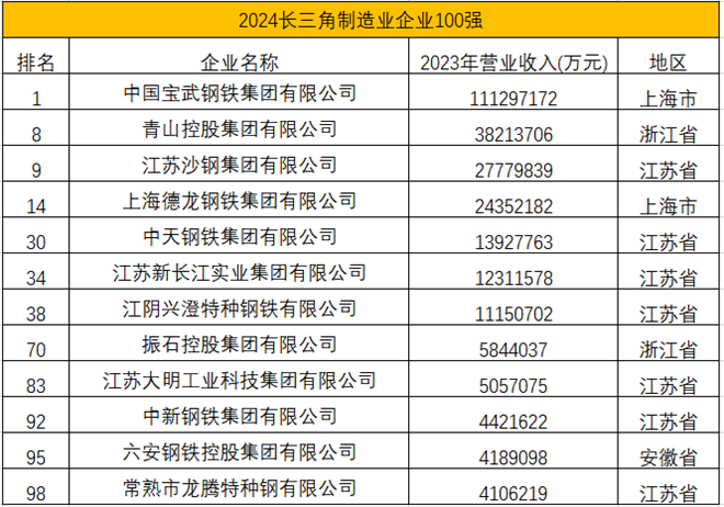 多家鋼鐵及相關(guān)企業(yè)進(jìn)入2024長三角企業(yè)100強(qiáng)和2024長三角制造業(yè)企業(yè)100強(qiáng),具體名單如下: