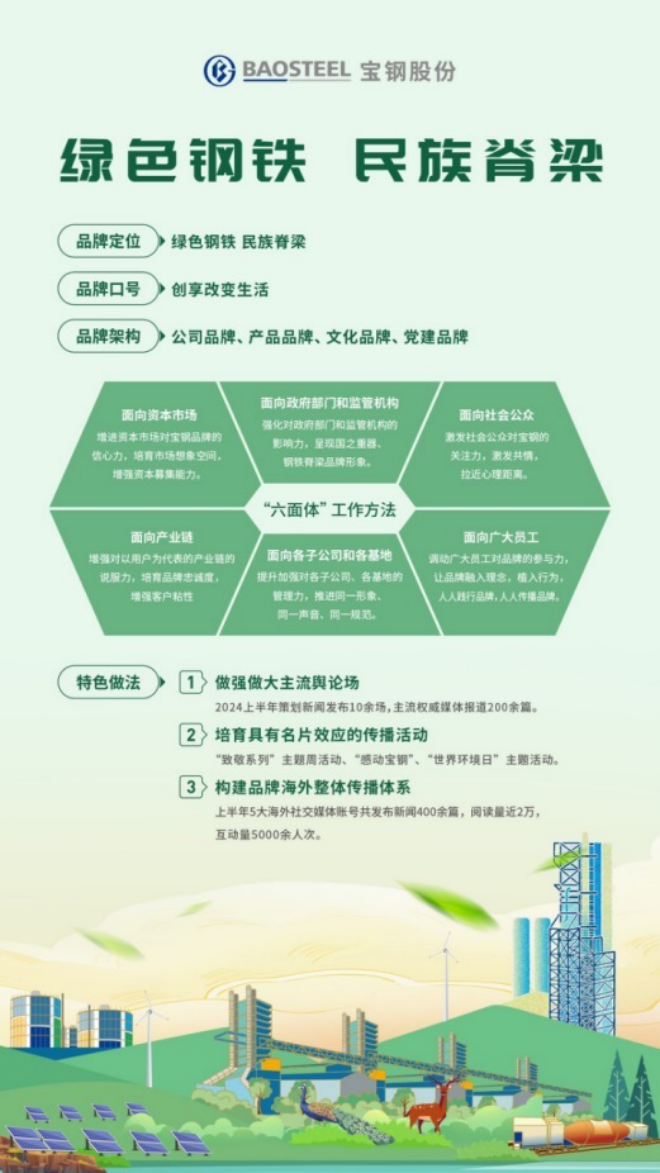 在“寶鋼”品牌創建過程中,注重完善品牌創建的各項要素。明確了品牌定位和核心價值主張,即“綠色鋼鐵 民族脊梁”。這一定位既體現了寶鋼股份在環保和可持續發展方面的努力,又彰顯了其在國家建設和經濟發展中的重要作用。