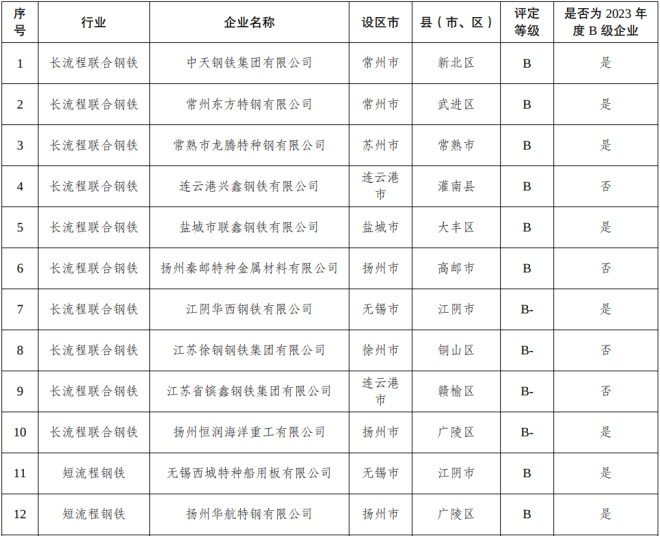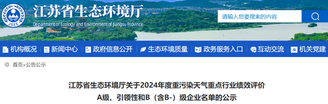 江蘇省生態環境廳關于2024年度重污染天氣重點行業績效評價A級、引領性和B(含B-)級企業名單的公示