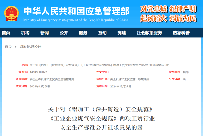 12月27日,應(yīng)急管理部網(wǎng)站發(fā)布了關(guān)于對(duì)《鋁加工(深井鑄造)安全規(guī)范》《工業(yè)企業(yè)煤氣安全規(guī)范》兩項(xiàng)工貿(mào)行業(yè)安全生產(chǎn)標(biāo)準(zhǔn)公開(kāi)征求意見(jiàn)的函。