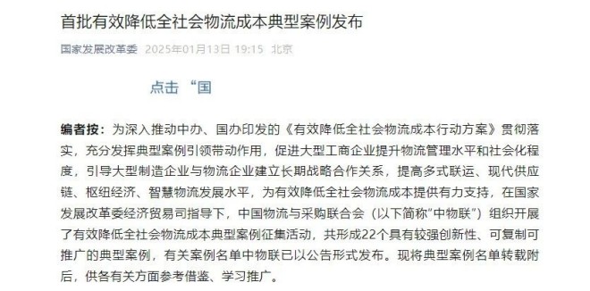 據(jù)國家發(fā)展改革委微信公眾號消息,在國家發(fā)展改革委經(jīng)濟(jì)貿(mào)易司指導(dǎo)下,中國物流與采購聯(lián)合會(以下簡稱“中物聯(lián)”)組織開展了有效降低全社會物流成本典型案例征集活動,共形成22個(gè)具有較強(qiáng)創(chuàng)新性、可復(fù)制可推廣的典型案例。