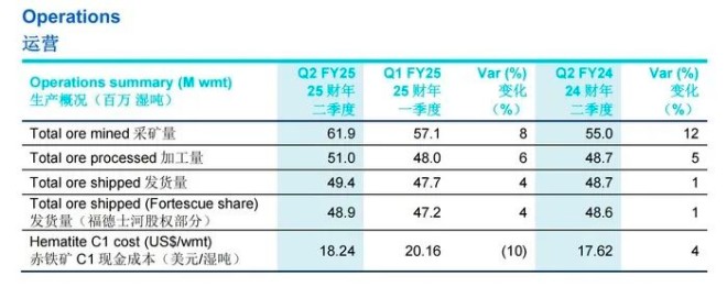 必和必拓全年產量指導目標保持不變,鐵礦石產量仍為2.82億-2.94億噸。福德士河全年鐵礦石發貨量目標仍為1.9-2億噸。