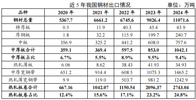 近五年,我國鋼材出口量持續增長態勢。2024年,我國鋼材出口總量達到11071.55萬噸,同比增長22.7%,較2020年增長106.3%。其中,2024年中厚板出口總量1042.10萬噸,同比增長22.2%,占出口鋼材總量的9.4%;熱軋板卷出口總量2743.04萬噸,同比增長30.8%,占出口鋼材總量的24.8%。