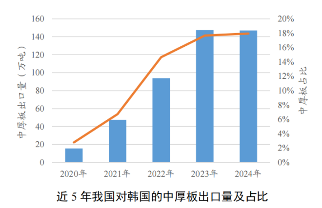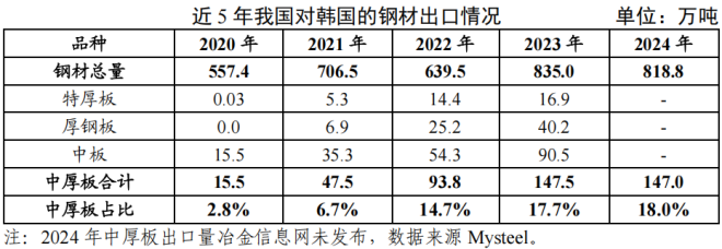 近五年,我國對韓國的鋼材出口呈波動增長態勢,其中中厚板占比呈穩定增長態勢。2024年,我國對韓國的鋼材出口總量818.75萬噸,同比下降1.9%,較2020年增長46.9%;其中,對韓中厚板出口量147萬噸,同比基本持平,但比2020年增長846.6%;占出口韓國鋼材總量的18%,占我國中厚板出口量的14.1%。