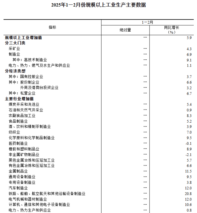分行業(yè)看,1-2月份,41個(gè)大類行業(yè)中有36個(gè)行業(yè)增加值保持同比增長(zhǎng)。其中,煤炭開采和洗選業(yè)增長(zhǎng)5.4%,石油和天然氣開采業(yè)增長(zhǎng)0.9%,農(nóng)副食品加工業(yè)增長(zhǎng)8.3%,酒、飲料和精制茶制造業(yè)增長(zhǎng)3.9%,紡織業(yè)增長(zhǎng)7.0%,化學(xué)原料和化學(xué)制品制造業(yè)增長(zhǎng)9.5%,非金屬礦物制品業(yè)下降2.1%,黑色金屬冶煉和壓延加工業(yè)增長(zhǎng)5.7%,有色金屬冶煉和壓延加工業(yè)增長(zhǎng)6.6%,通用設(shè)備制造業(yè)增長(zhǎng)9.5%,專用設(shè)備制造業(yè)增長(zhǎng)3.8%,汽車制造業(yè)增長(zhǎng)12.0%,鐵路、船舶、航空航天和其他運(yùn)輸設(shè)備制造業(yè)增長(zhǎng)20.8%,電氣機(jī)械和器材制造業(yè)增長(zhǎng)12.0%,計(jì)算機(jī)、通信和其他電子設(shè)備制造業(yè)增長(zhǎng)10.6%,電力、熱力生產(chǎn)和供應(yīng)業(yè)增長(zhǎng)0.8%。