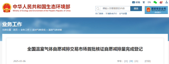 生態環境部召開3月例行新聞發布會,生態環境部新聞發言人裴曉菲表示,近日,全國溫室氣體自愿減排交易市場首批核證自愿減排量(CCER),總計948萬噸二氧化碳當量完成登記。這是我國自愿碳市場建設取得的重要實質性進展,對于推動和激勵我國更廣泛的行業企業參與綠色低碳發展具有重要意義。根據最新統計數據,截至3月25日,CCER累計成交量達133萬噸,成交額為1.05億元。