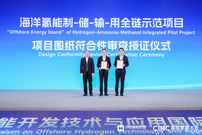 研討會上,中國氫能聯(lián)盟秘書長、國家能源集團(tuán)氫能事業(yè)部主任、國華投資(氫能公司)總經(jīng)理劉瑋作了《海洋氫能發(fā)展展望及“海上氫氨醇一體化能源島示范”實(shí)踐》開幕報(bào)告。中國船級社(CCS)海工技術(shù)中心副主任李紅濤為國家能源集團(tuán)氫能科技有限責(zé)任公司、煙臺中集來福士海洋工程有限公司和國能氫創(chuàng)科技(北京)有限公司聯(lián)合研發(fā)的海洋氫能制-儲-輸-用全鏈?zhǔn)痉俄?xiàng)目頒發(fā)圖紙符合性證書。