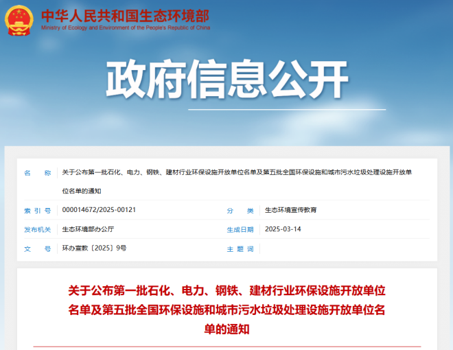 近日,生態(tài)環(huán)境部網(wǎng)站發(fā)布了《關(guān)于公布第一批石化、電力、鋼鐵、建材行業(yè)環(huán)保設(shè)施開放單位名單及第五批全國環(huán)保設(shè)施和城市污水垃圾處理設(shè)施開放單位名單的通知》(以下簡稱《通知》)。