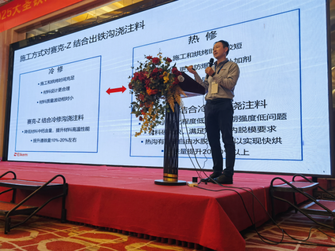 埃肯國際貿易(上海)技術經理戴長浩在《微硅粉及無水泥結合劑在出鐵溝澆注料中的應用》報告中,闡述新型材料在出鐵溝澆注料中的應用優勢。