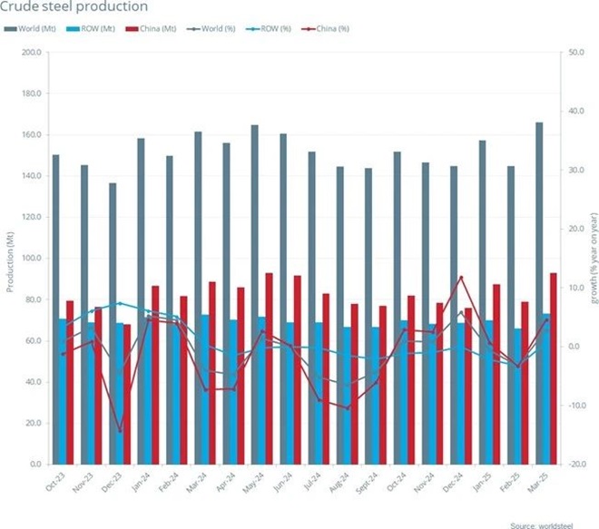 2025年3月全球粗鋼產(chǎn)量