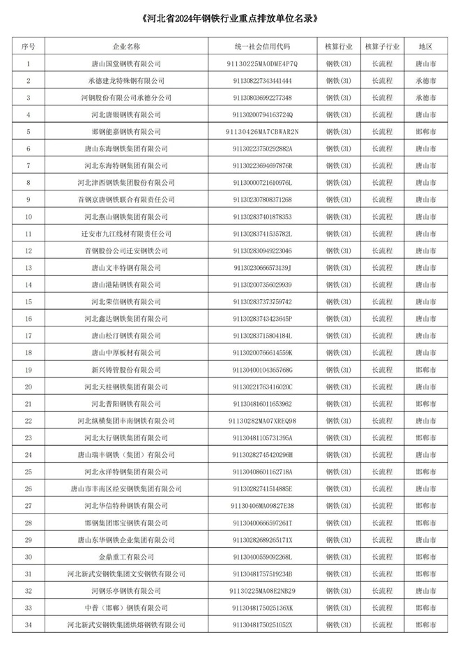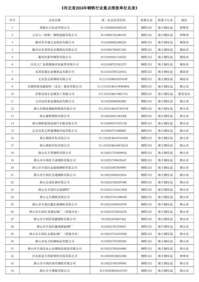 根據《碳排放權交易管理暫行條例》《生態環境部辦公廳關于做好2025年全國碳排放權交易市場有關工作的通知》(環辦氣候函〔2025〕140號)有關規定,現將河北省2024、2025年度納入全國碳排放權交易市場鋼鐵、水泥、有色金屬行業重點排放單位名錄公布如下。