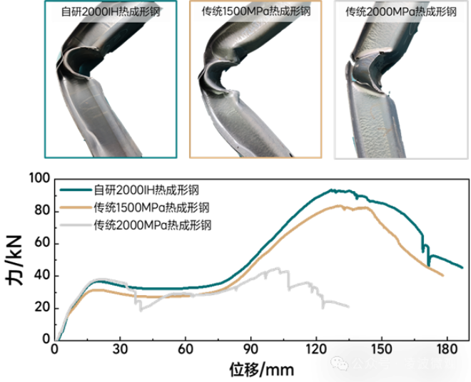 2000IH熱成形鋼,采用低碳+多元元素配比調控,引入有限的微合金化元素,結合富碳化物元素,形成多尺度析出物,在保持傳統2000MPa級熱成形鋼超高強度的同時,實現韌性和抗氫脆延遲開裂性能的顯著提升。這一雙重優勢使得2000IH熱成形鋼在力學性能優異——高變形抗力、接近1500MPa級熱成形鋼的韌性。2000IH熱成形鋼的吸能能力相較于傳統2000MPa級材料提升了約78%,相較于1500MPa級材料則提升了約10%。