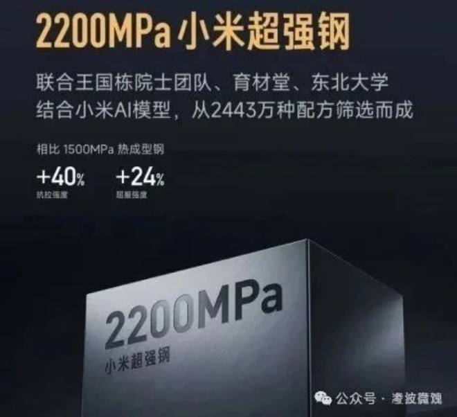 5月22日小米發布,2200MPa超強鋼,是目前強度最高的汽車鋼。相比1500MPa 熱成形鋼,抗拉強度提高40%,A柱承載提高25%,B柱承載提高70.5%,2200MPa超強鋼使用在全車四門防撞梁上,能提升側面碰撞中的乘員艙保護,前門防撞梁承載能力提升 52.4%,后門防撞梁承載能力提37.6%。