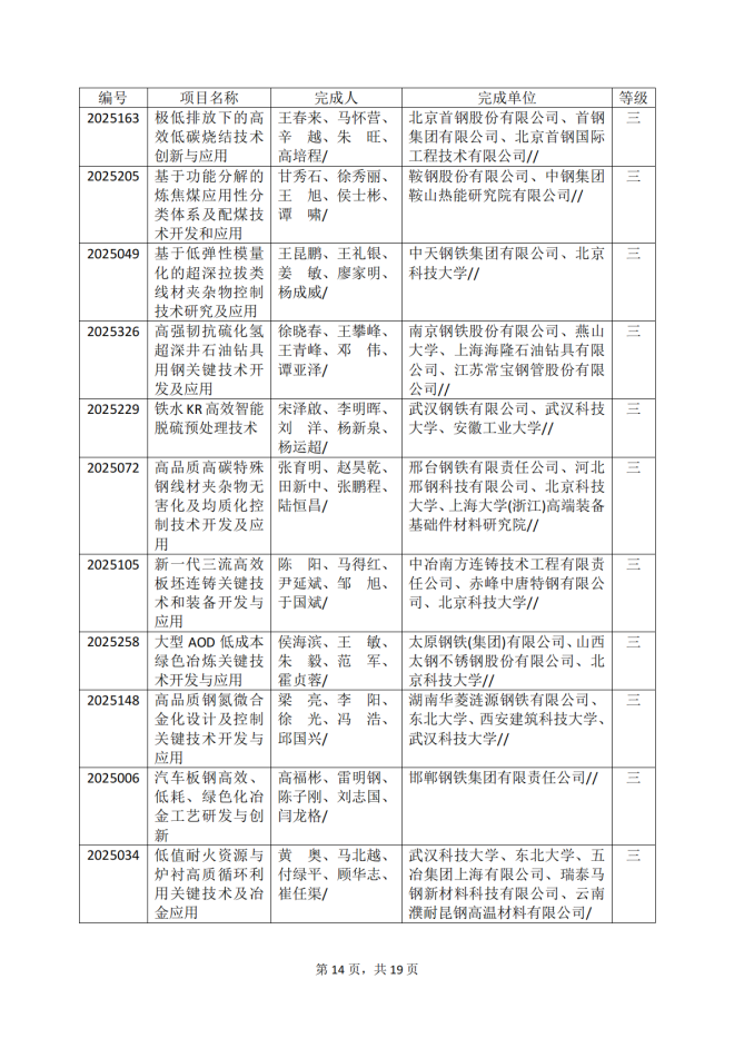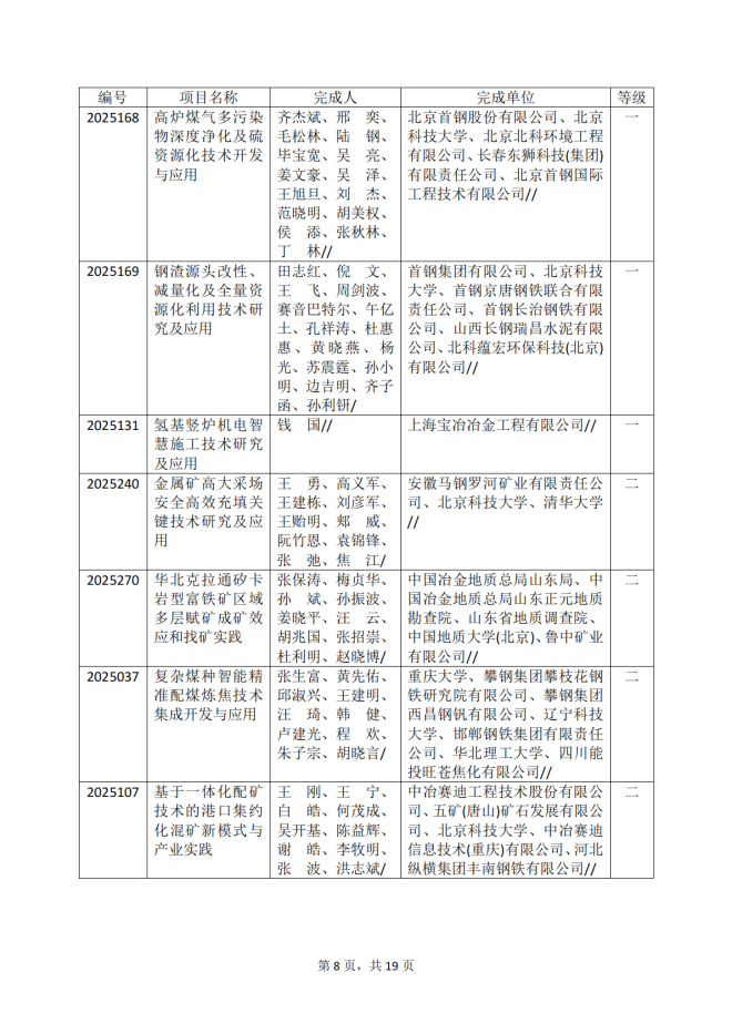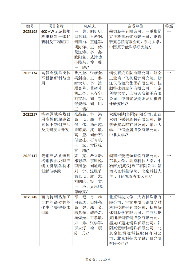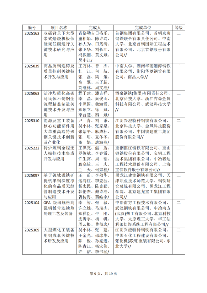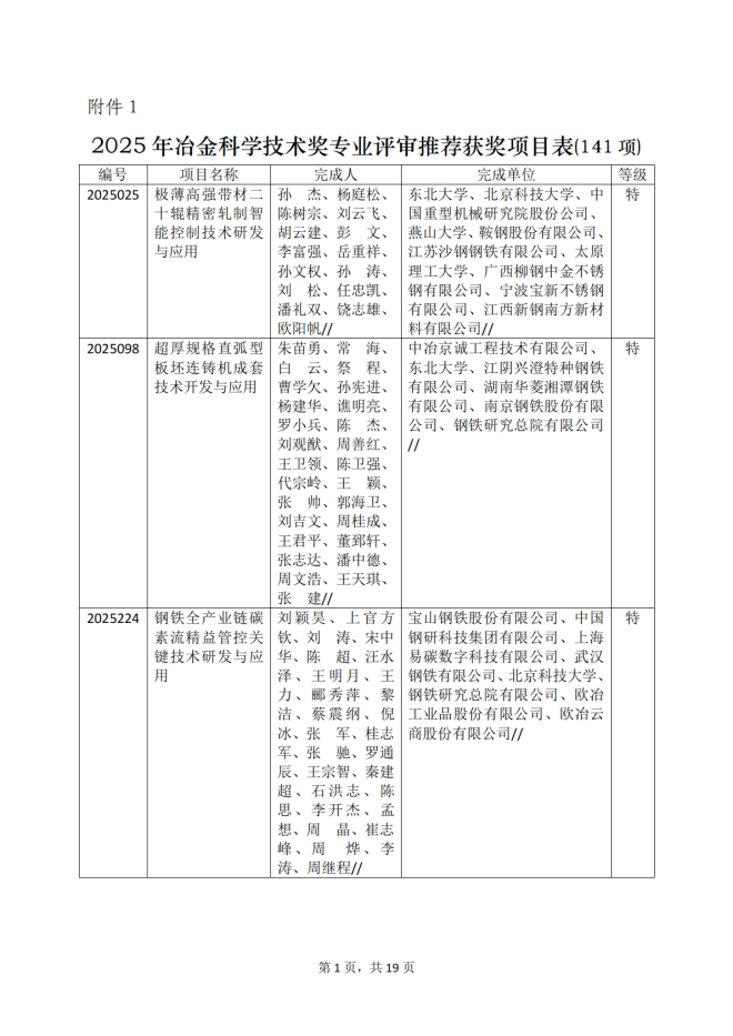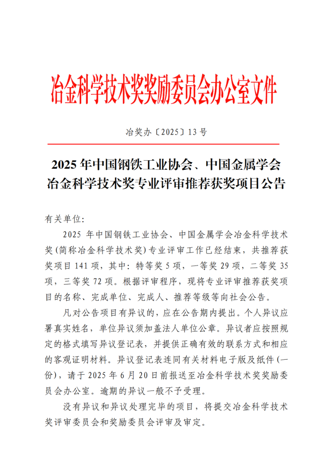 2025年冶金科學技術獎專業評審推薦獲獎項目公告
