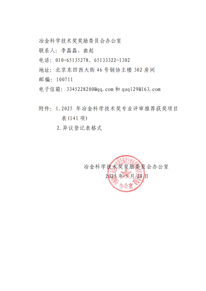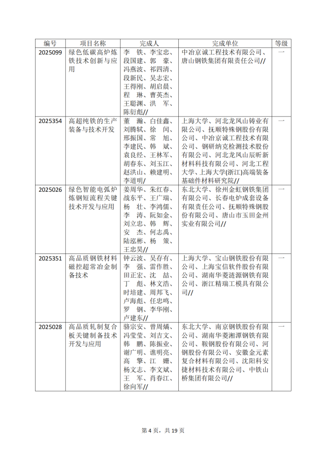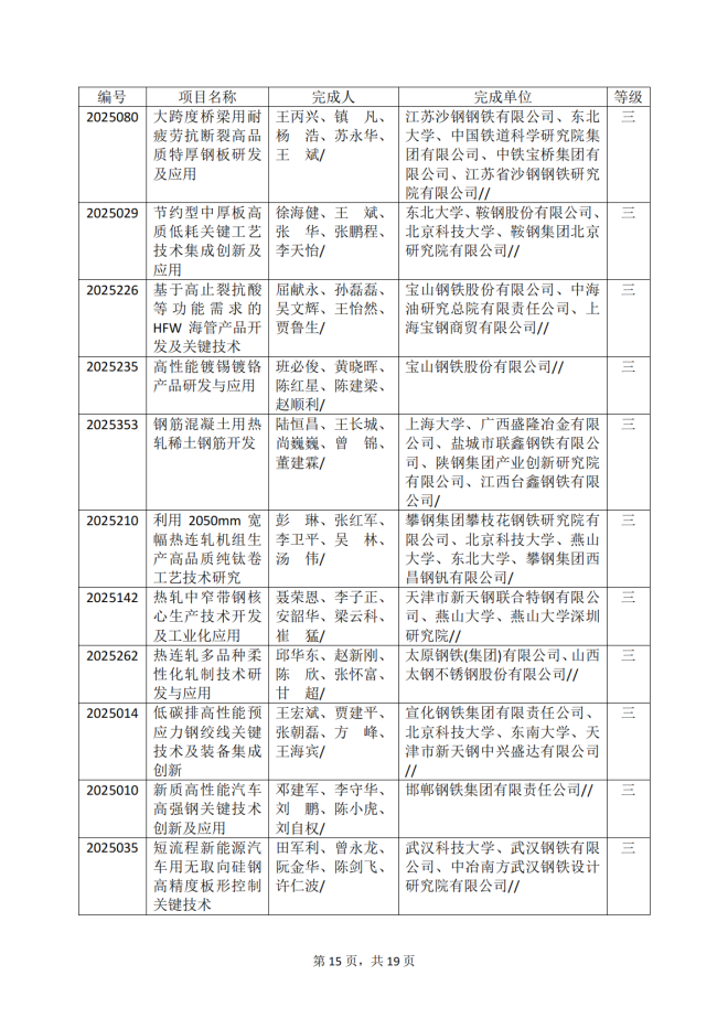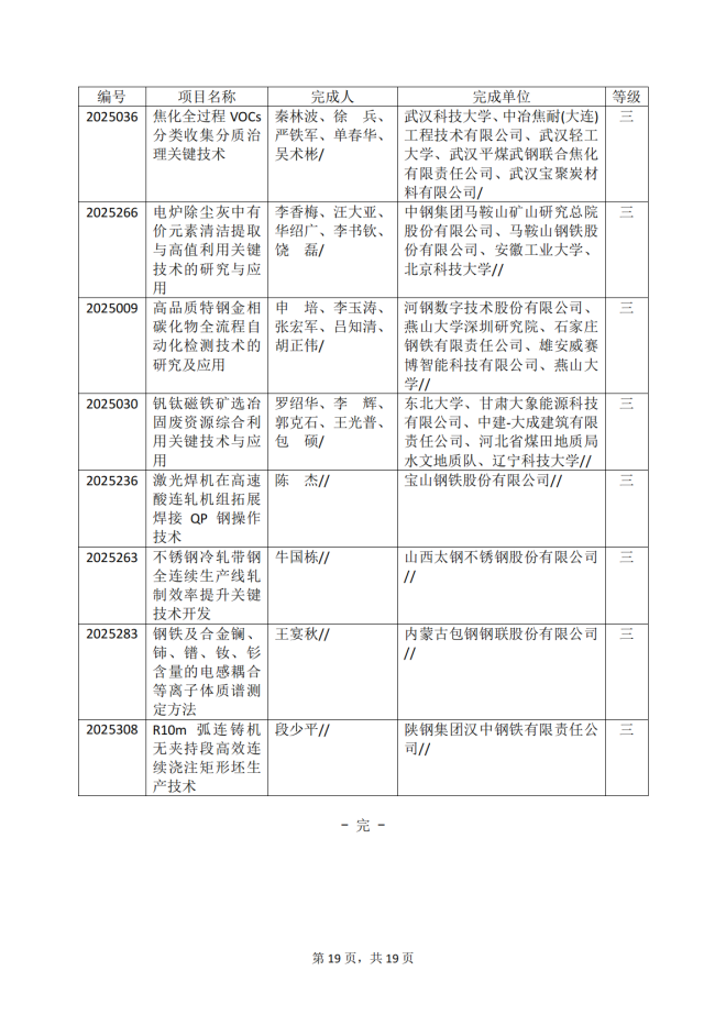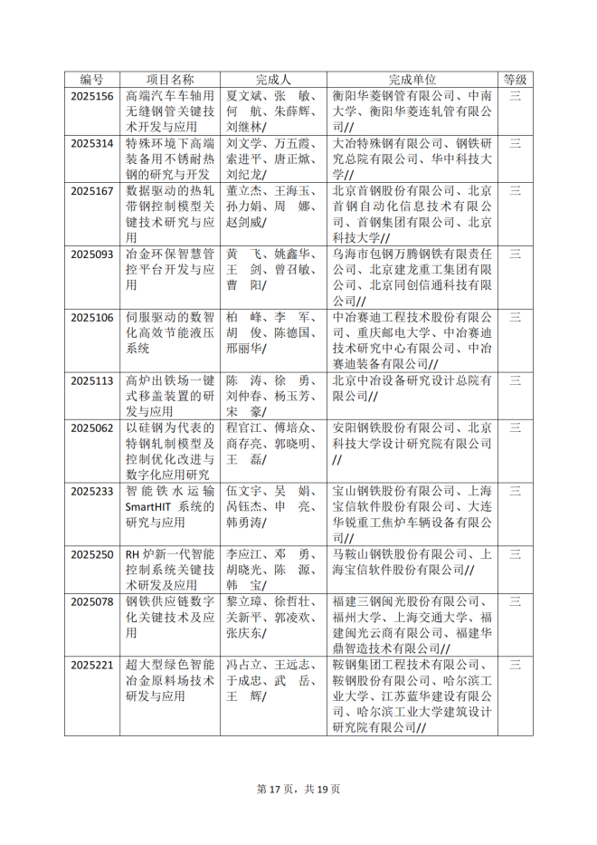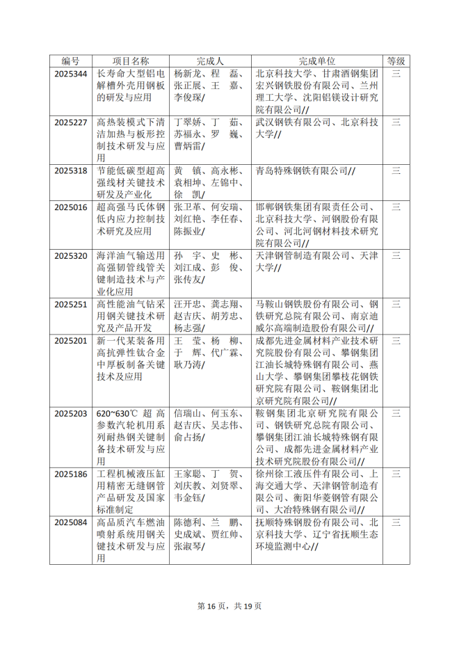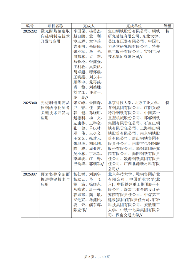 2025年冶金科學技術獎專業評審推薦獲獎項目公告
